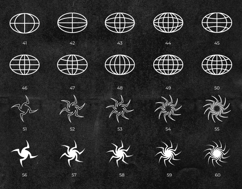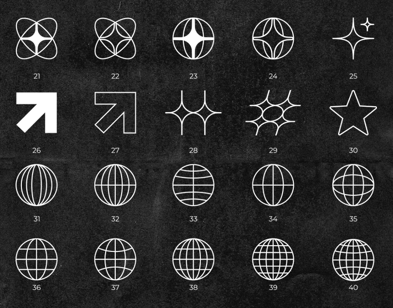A set of over 21 wireframe shapes in various categories such as grids, geometric shapes, and abstract elements. They can be combined to create compositions or added as accents to your designs for a retro-futuristic vibe. Usage examples: posters, album covers, stickers, logo elements.