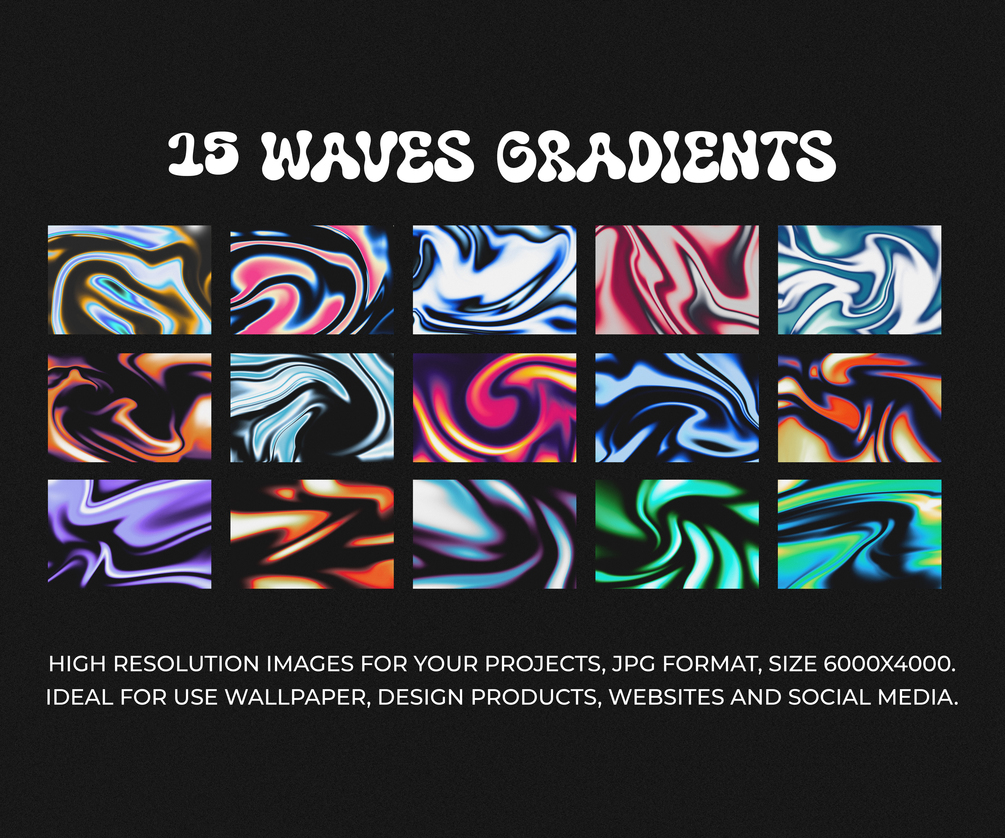 Wave Gradients is a set of 15 backgrounds with grainy textures. It has a high resolution of 6000x4000, all backgrounds are in jpg format. Ideal for use as wallpaper, design products, websites and social media.