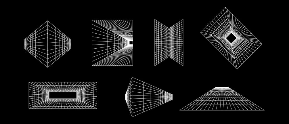 A set of over 23 wireframe shapes in various categories such as grids, geometric shapes, and abstract elements. They can be combined to create compositions or added as accents to your designs for a retro-futuristic vibe. Usage examples: posters, album covers, stickers, logo elements.